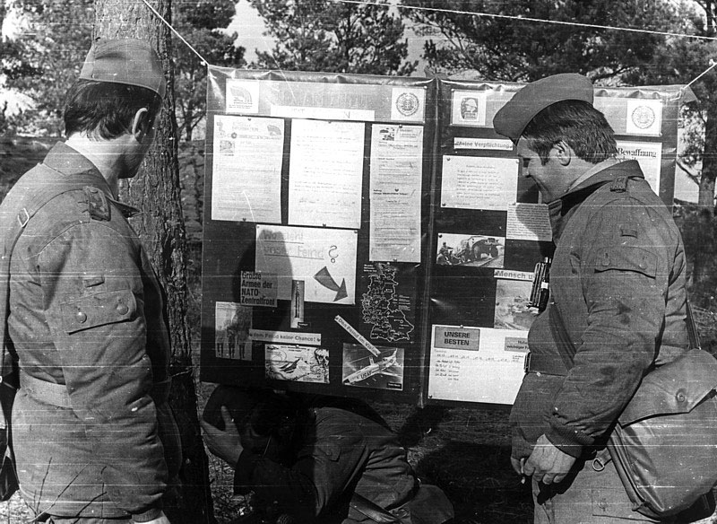 Die betrachtenden Soldaten tragen die Watteuniform "grau",